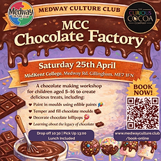 ๐ซโจ BACK BY POPULAR DEMAND โจ๐ซ Step inside the MCC Chocolate Factory for a hands on chocolate adventure, created in collaboration with The Curious Cocoa Company. Inspired by the magic of classic chocolate factories, children may feel like they have discovered their very own Golden Ticket. Children aged 5 to 16 will become mini chocolatiers for the morning, creating delicious treats while learning about the fascinating journey of chocolate from bean to bar. During this session they will: ๐ซ Paint chocolate moulds with edible paints ๐ซ Help temper real chocolate ๐ญ Fill moulds and decorate chocolate lollipops ๐ Learn about the origins and history of chocolate Every child will take home their handmade chocolate creations to share with family and friends. 10:30 am - Drop off. 10:30 am - 10:45 am - Ice-breaker activities. 10:45 am - 12:30 pm - Medway Chocolate making and lesson on legacy. 12:30 pm - Lunch. 1:00 pm - Collection.